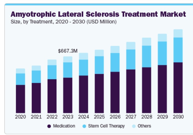 AZ ALS piacmérete 2023-ban globálisan 667.3 millió USD volt. Ebbe beleértendő az ALS gyógyszerek és az őssejt-terápia összes forgalma és értékesítése. Ez nagyobb mint egy elefánt (a szobában). A projekció szerint 2030-ra ez el fogja érni a 987.6 millió USD-t.