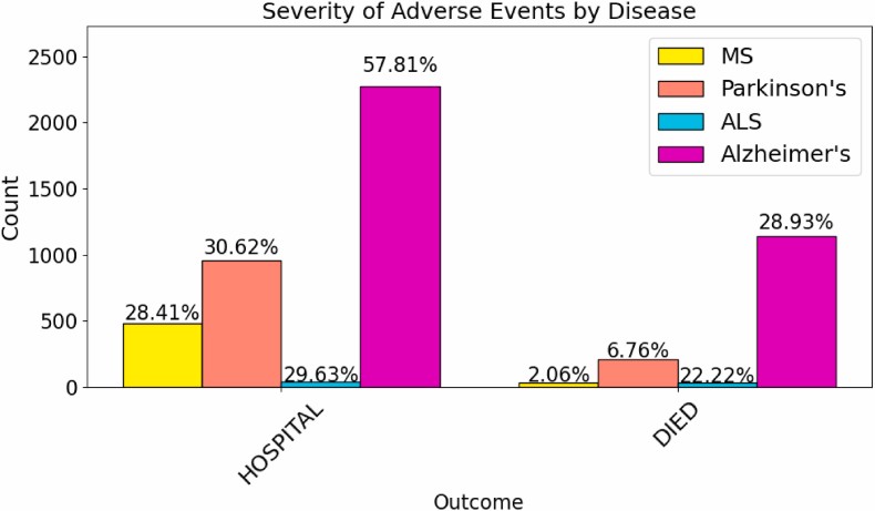 Ábra a cikkből: A négy betegség közül az ALS-ben jelentkeztek a legsúlyosabb mellékhatások az oltást követően. Az oltást következtében kialakult mellékhatások 30%-a olyan súlyosságú volt, ami miatt kórházba kellett szállítani a beteget, a bejelentett mellékhatások 22%-ban pedig meghalt a beteg. Az ábrából kiolvasható, hogy az Alzheimer betegek még rosszabból reagáltak az oltásra, ami a súlyos következményeket illeti.
